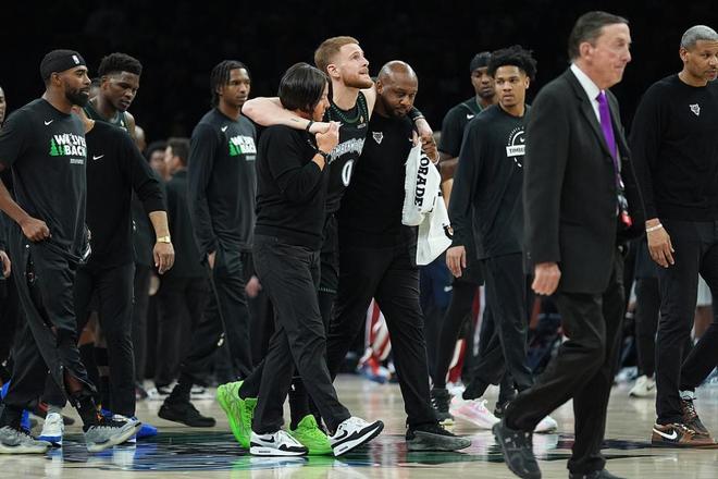 突发!森林狼主力迪文琴佐开局79秒受伤 被搀扶回更衣室